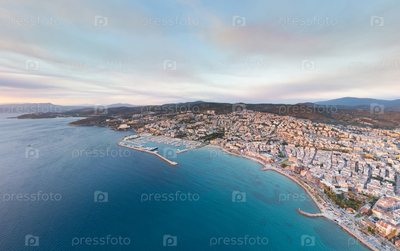 Кусадаси, Турция. вид с воздуха на далекие горы, залив и яхт-марину. прибрежный ландшафт с рекреационными объектами. взгляд с воздуха