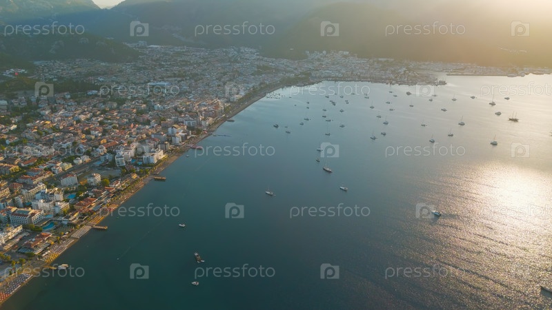 Панорамный вид с воздуха на береговую линию, залив и город в утреннем свете. Прибрежный городской ландшафт с отелями и пляжами.. Aerial View