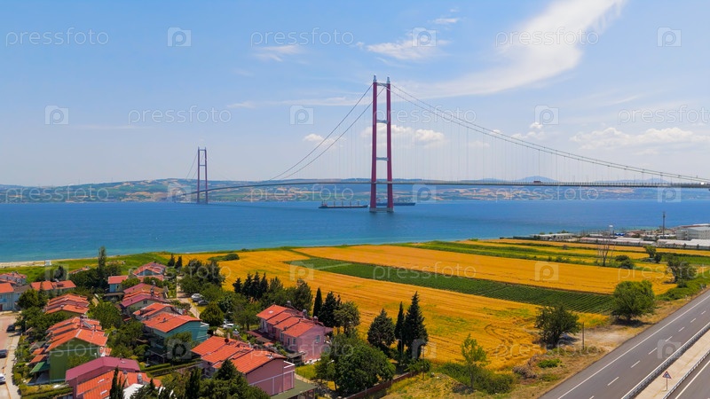 Лапсеки, Турция. 1915 мост Чанаккале с движущимися автомобилями выше и несколькими грузовыми судами и пассажирским паромом на Дарданеллах ниже
