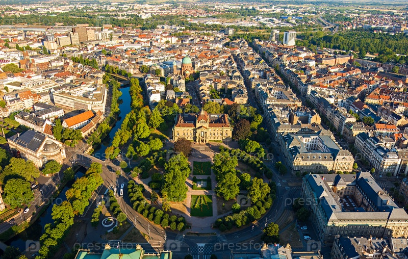 Страсбург, Франция.Palais du Rhin - прусский нео-Ренессансный дворец построен в 1880-х годах.Панорама центра города летом утром.Вид с воздуха