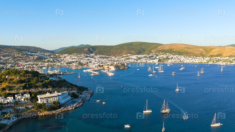 Бодрум, Турция.Взгляд с беспилотного летательного аппарата на Марину Бодрума, заполненную яхтами и исторический замок Бодрум на береговой линии со знаменитыми белыми домами