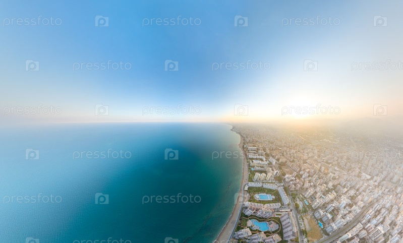 Мерсин, Турция.Пляж и набережная Мезитли при закате солнца с отражением солнца на влажном песке.Средиземное море, жилой горизонт и горы исчезают в теплом сумерках.Вид из воздуха