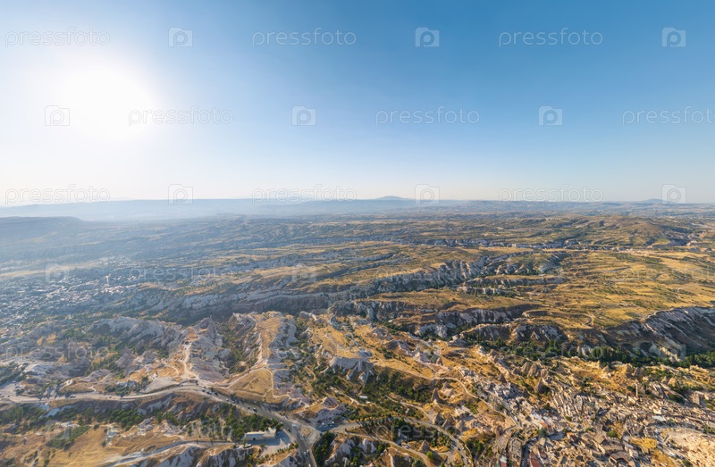 Широкая воздушная панорама плато Каппадокии, показывающая обширную дисекцию долинами и каньонами через вулканическую местность под ярким утренним солнцем