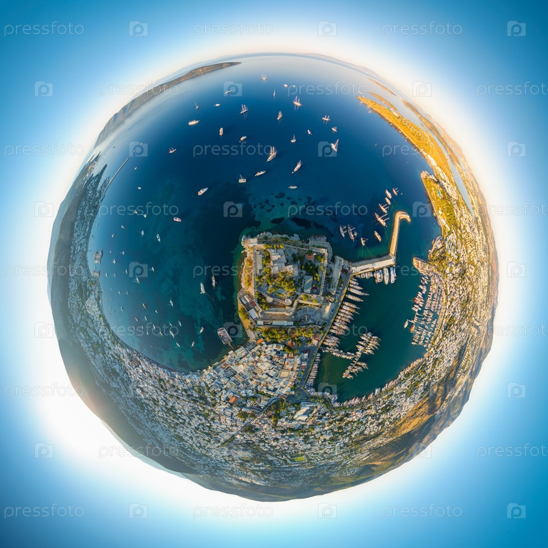 Астероидный вид, показывающий замок Бодрум, яхтенную пристань, бухту с яхтами и белые дома на склонах холма в утреннем свете. 360-градусная панорамная аэрофотосъемка астероида