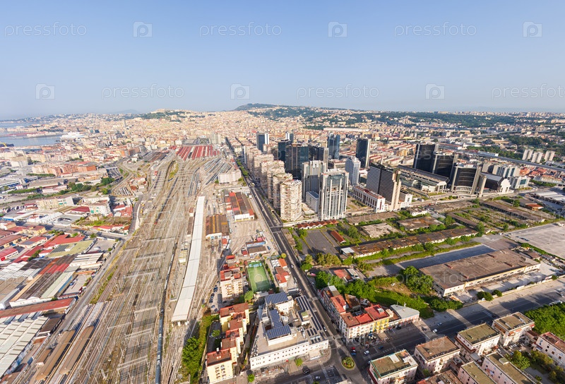 Неаполь, Италия. Железнодорожный вокзал - Napoli Centrale. Centro direzionale это деловой район в Неаполе. Панорама города летом. Солнечная погода. Вид с воздуха