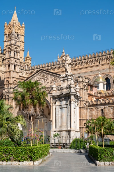 Статуя Святой Розалии в саду собора Палермо Солнечный летний день