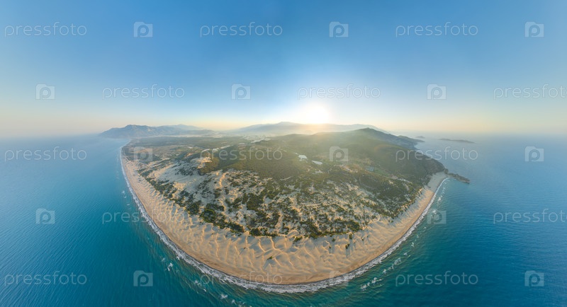 Полный панорамный вид с пляжа Патара на землю, древний город, горы, песчаные дюны, римский маяк и далекие теплицы утром