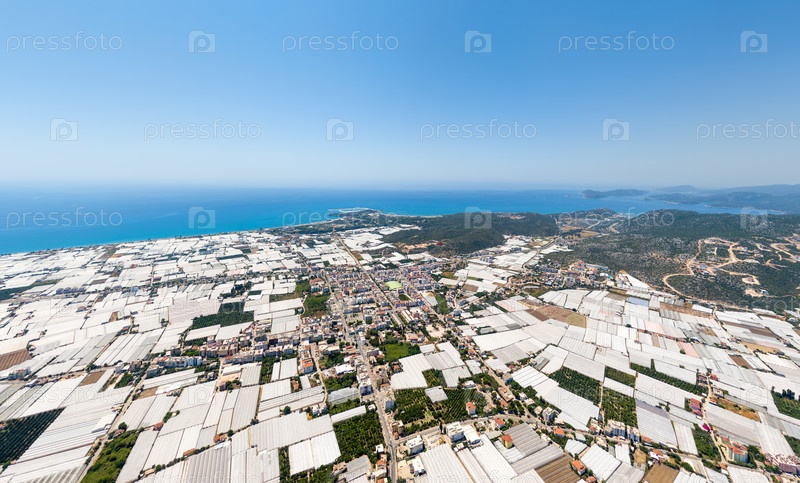 Вид с воздуха города Демре, который выглядит как остров городской жизни, окруженный со всех сторон обширным сияющим морем белых парниковых полей под летним солнцем