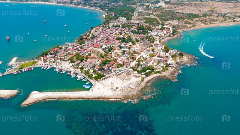 Панорама с воздуха древнего полуострова со Средиземноморским побережьем, историческими руинами и гаванью под ярким летним солнцем