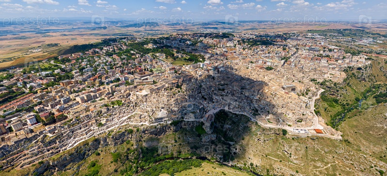 Матера, Италия. город в итальянском регионе Базиликата, административный центр провинции Матера. старая часть города высечена из скалы и является объектом ЮНЕСКО. вид с воздуха