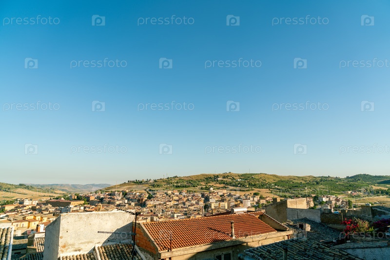 Пиетраперция, Сицилия, Италия Панорама города с крышами Время захода солнца