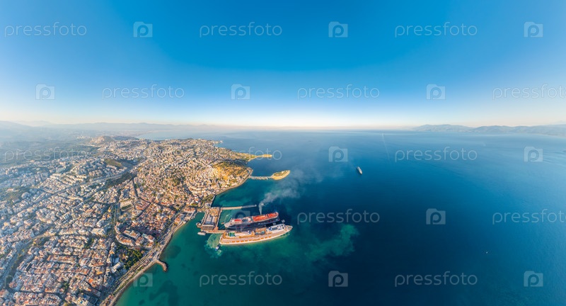 Кусадаси, Турция.Панорама бухты с воздуха, порт с лайнерами, набережная, остров Голубей, гора Кесе.Круизная яхта в море под утренним светом.Вид с воздуха