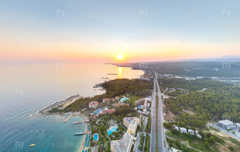 Обширный снимок заката на шоссе D400, обрамленном сосновыми и оливковыми деревьями, ведущих к солнцу над песчаными пляжами и приморскими гостиницами