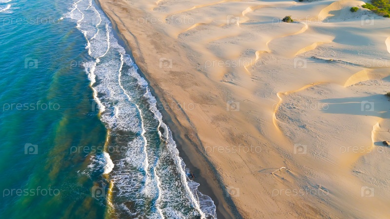 Близкий взгляд с воздуха на белые пеновые волны на береговой линии пляжа Патара, голубую Средиземноморскую воду и влажный песок в утреннем свете