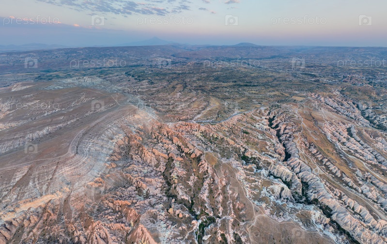 Широкий воздушный снимок текстурированного плато Каппадокии с розовыми слоями скал и глубоко вырезанными долинами, наполненными темно-зеленой лиственницей в золотое время