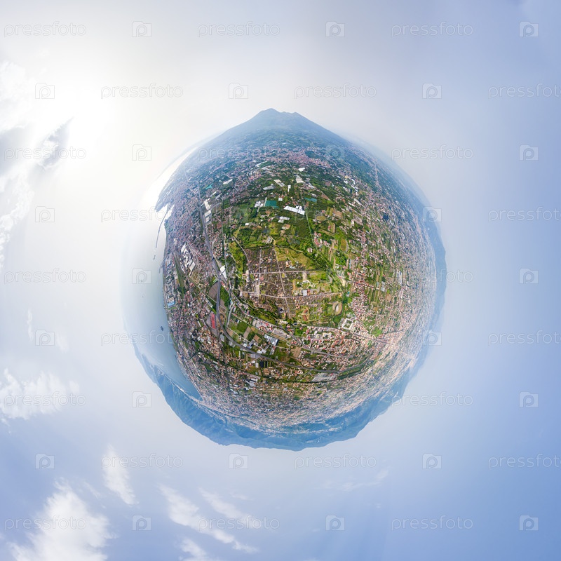 Помпеи, Неаполь, Италия. Руины древнего города. Вид на вулкан Висувий, город и море. Лето, днем. 360-градусный панорамный астероид с воздуха