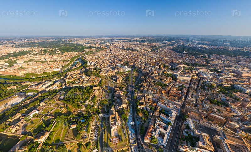 Рим, Италия. Исторический центр. Город в пределах досягаемости. Панорама города летом утром. Вид с воздуха
