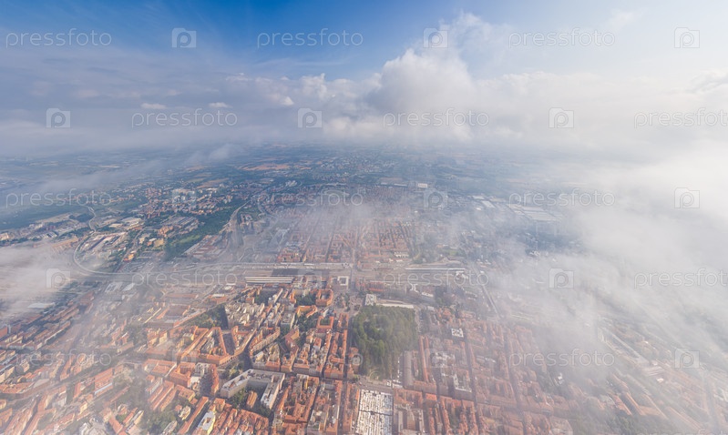 Болонья, Италия. Исторический центр. Панорама города в летний день. Летание по облакам. Вид с воздуха