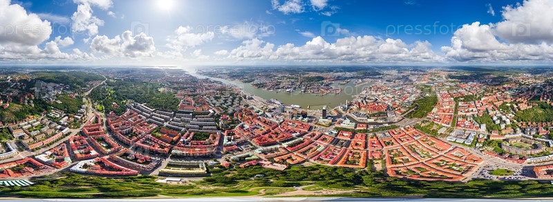 Гетеборг, Швеция. Skansen Kronan - крепостная башня. Панорама города летом в пасмурную погоду. Панорама 360