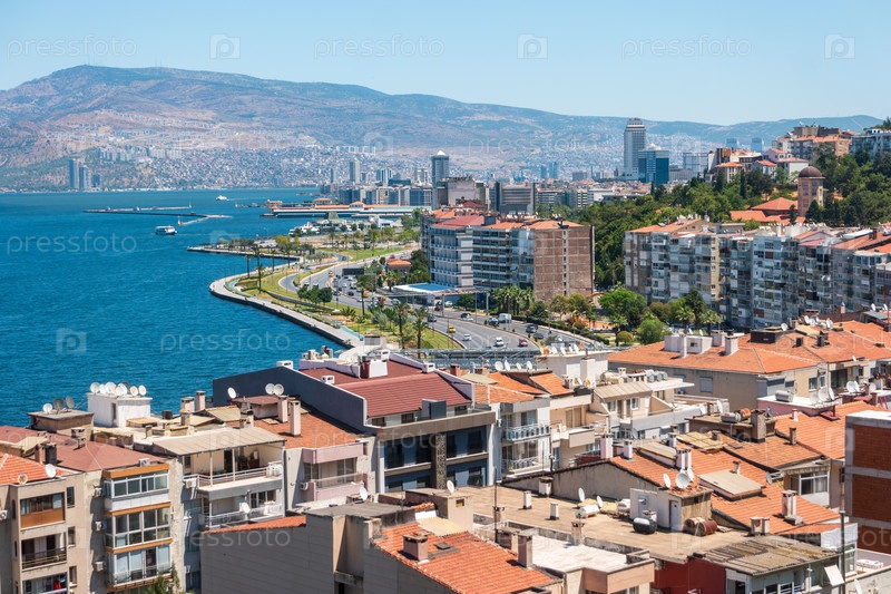 Вид с террасы исторического здания лифта, выходящего на жилые многоэтажки, бульвар Мустафы Кемаля Сахила, извивающийся вдоль берега и обширный залив Измира с городом