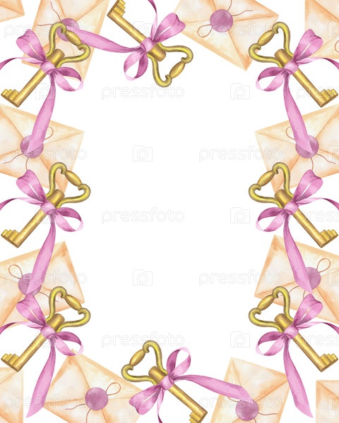 Рамка ключей с луками и конвертом. иллюстрация ручной акварели. для дизайна упаковки, карточек, обложки, принтов, этикеток на продуктах и ткани