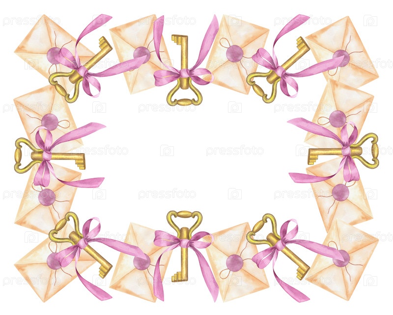 Горизонтальная рестангулярная рама ключей с луками и конвертом. иллюстрация ручной акварели. для дизайна упаковки, карточек, обложки, печатных изображений, этикеток на продуктах и ткани