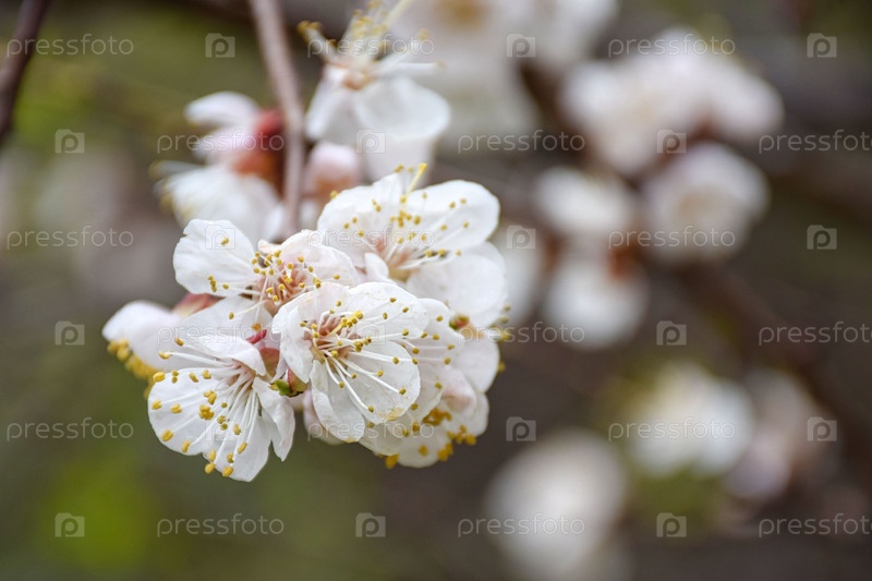 Ветка дерева абрикоса с белыми цветами и бутонами весной. Цветение абрикоса крупным планом. Красивые весенние цветы