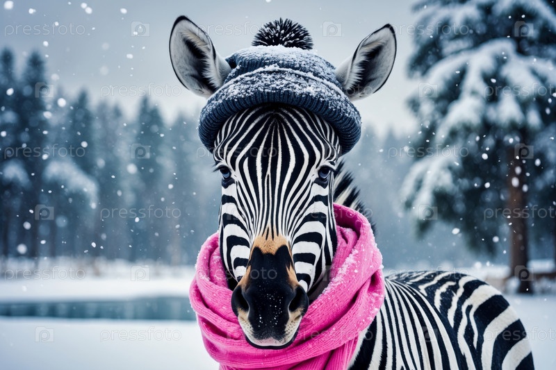 Портрет зебры в вязанной зимней одежде шляпы и шарфа, животное в снежных дождях зимой AI Generative