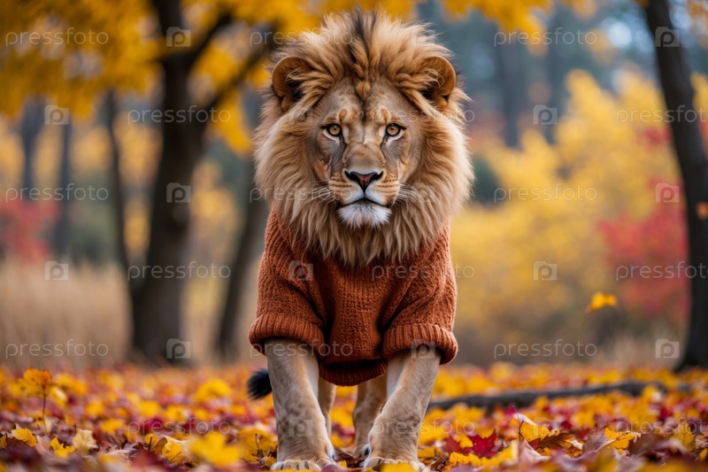 Лев в трикотажном свитере осенний лесный фон, животное в красно-желтых листьях AI Generative