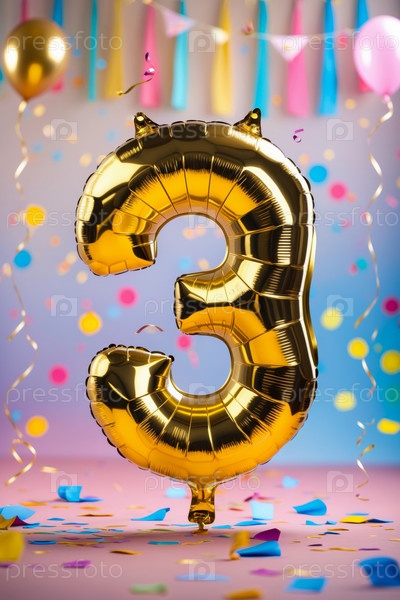 Гелиевый баллон рождения формы номер три, фигура золотой буквы 3 на праздновании праздничный фон