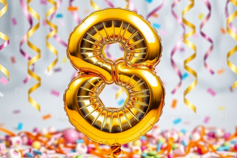 Гелиевый баллон на день рождения формы номер восемь, фигура золотой буквы 8 на праздновании праздничный фон