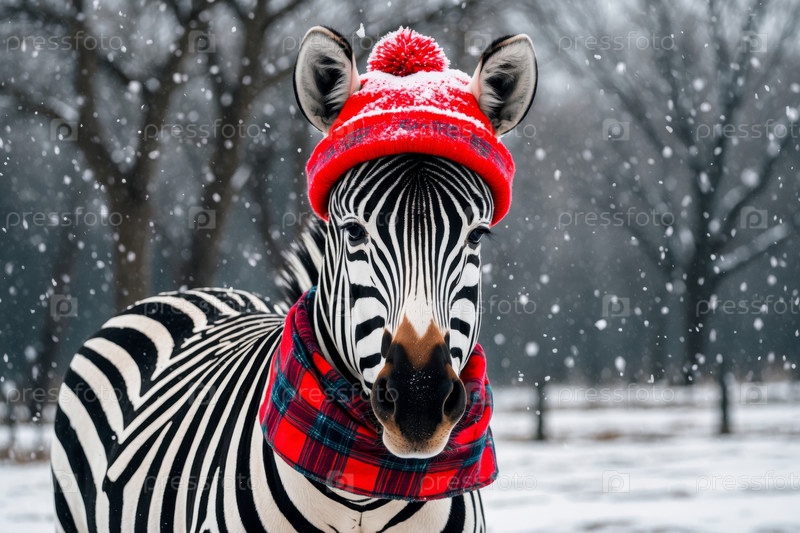 AI Generative Портрет зебры в трикотажных зимних одеждах шляпа и шарф, животное в снежном снегу зимой