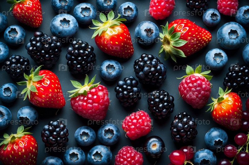 Созданный с помощью ИИ узор в стиле «плоская раскладка»: спелые лесные ягоды, вид сверху на свежем летнем органическом фоне