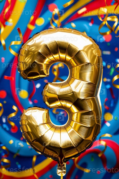 Гелиевый баллон рождения формы номер три, фигура золотой буквы 3 на праздновании праздничный фон