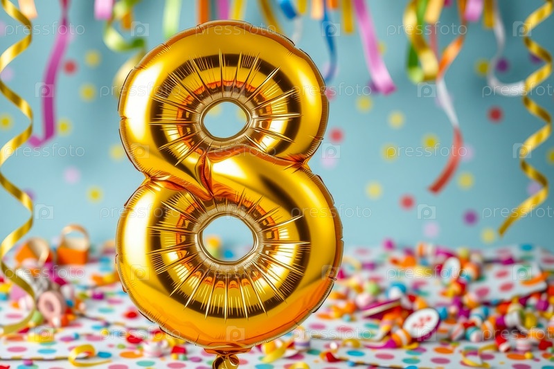 Гелиевый баллон на день рождения формы номер восемь, фигура золотой буквы 8 на праздновании праздничный фон