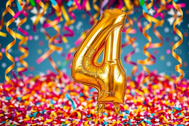 Гелиевый баллон на день рождения формы номер четыре, фигура золотой буквы 4 на праздновании праздничный фон