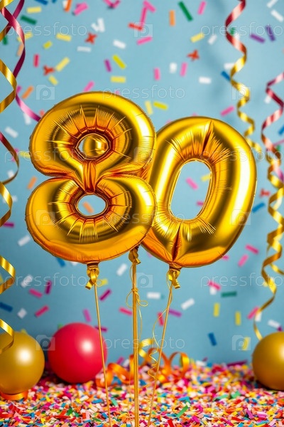Гелиевый день рождения шарик формы номер восемьдесят, золотые буквы фигура 80 праздник праздничный фон декор
