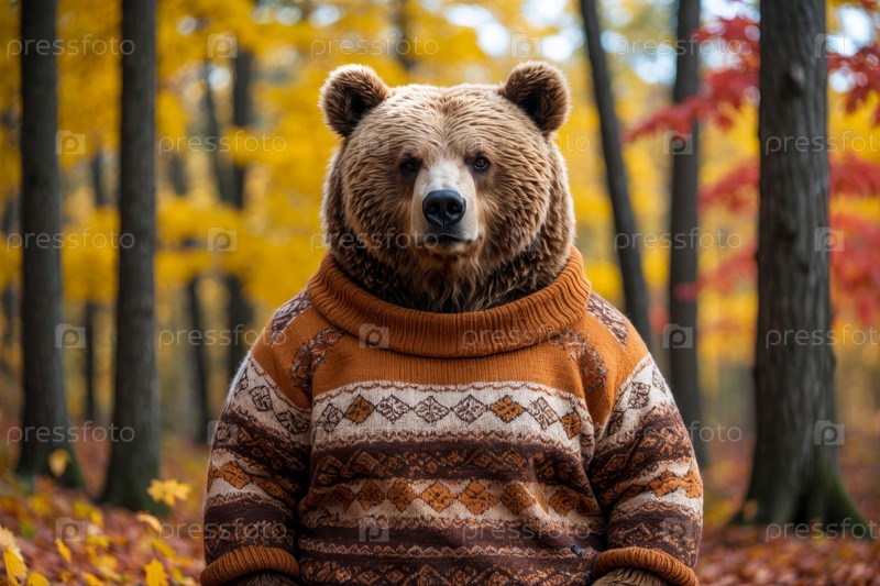 Медведь в трикотажном свитере на фоне осеннего леса, животное в красно-желтых листьях AI Generative