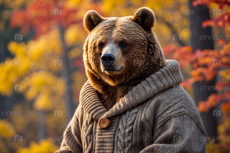 Медведь в трикотажном свитере на фоне осеннего леса, животное в красно-желтых листьях AI Generative