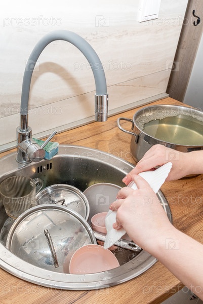 Женщина руками моет посуду, домохозяйка делает домашние дела и убирает дом