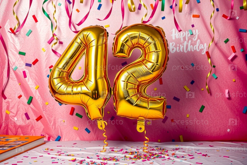 Гелиевый день рождения шарик формы номер сорок два, золотые буквы фигура 42 праздник праздничный фон декор