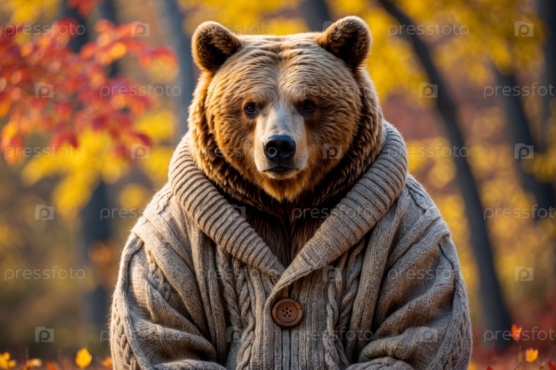 Медведь в трикотажном свитере на фоне осеннего леса, животное в красно-желтых листьях AI Generative