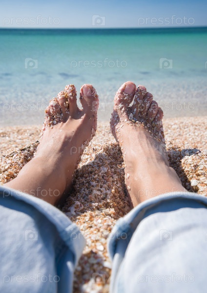 Женские ступни ног в ракушках на побережье Лазурного моря