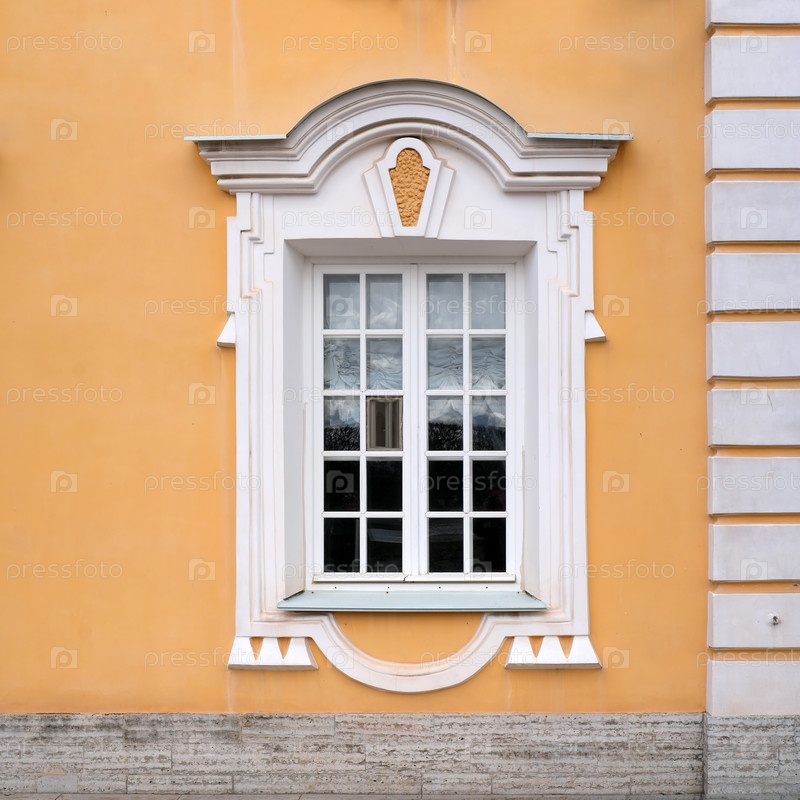 Декоративная стеновая часть барокко с арочным окном на желтом фасаде, изолированные детали