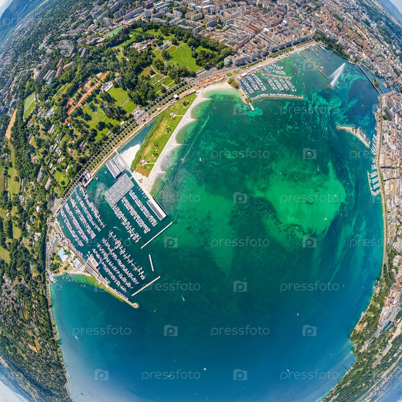 Женева, Швейцария. Фонтан Дже-Дэу. Женевское озеро. Панорама летом. Вид с воздуха