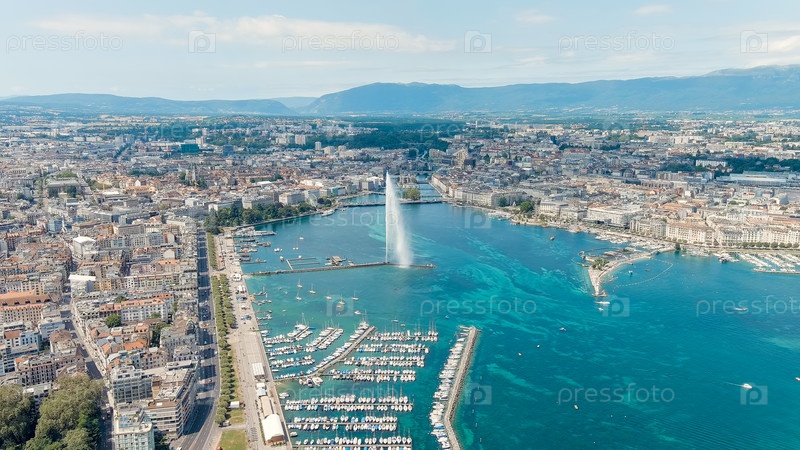 Женева, Швейцария. Фонтан Дже-Дэу. Большой реактивный фонтан высотой до 140 метров. Главная достопримечательность озера Женева. Летний день, Aerial View