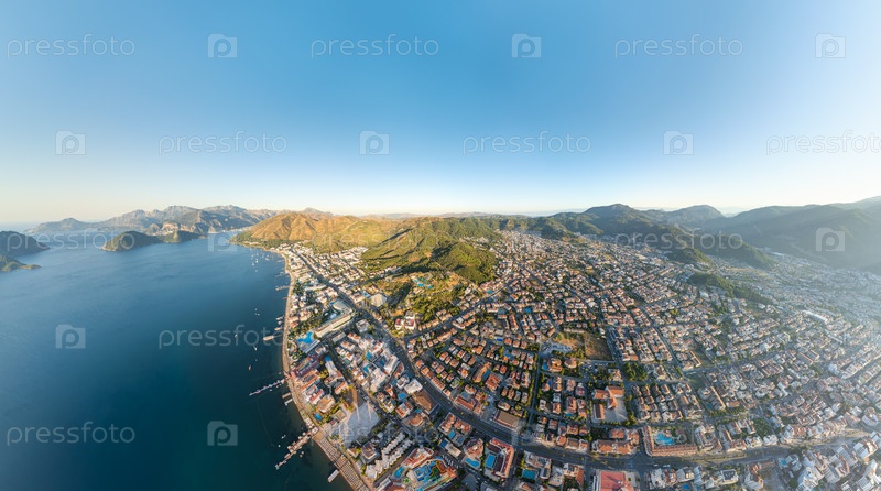 Панорамный взгляд с воздуха на вход в залив, горы, пляжи, город и утренние улицы сверху Прибрежный подход к Мармарису