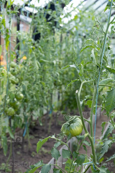 Помидор томат зеленый незрелый в теплице, выращивание сельскохозяйственной культуры