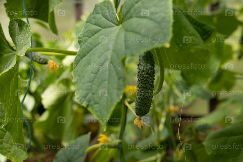 Зеленые огурцы и желтые цветы на стебле с пышными листьями растут в теплице