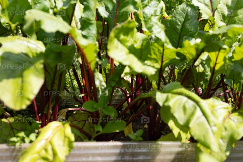 Растения свеклы с ярко-зелеными листьями и красноватыми стеблями густо растут в садовой почве